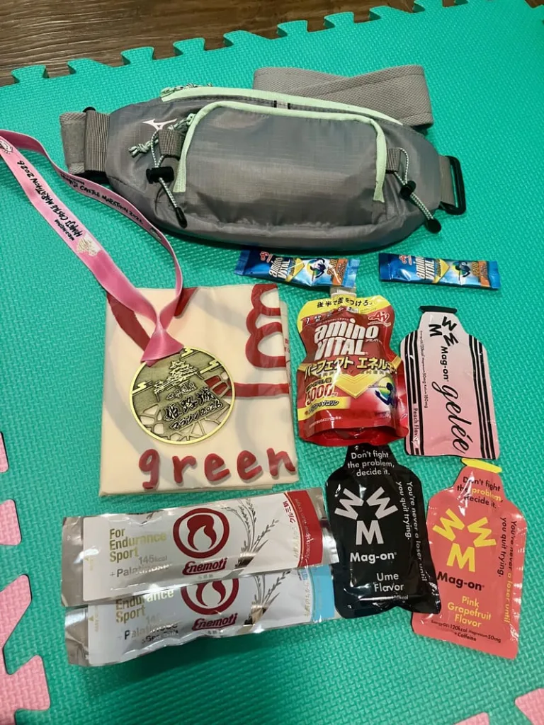 アミノバイタル、数枚のゴミ袋、1時間毎に摂取する予定のエネルギー補給食、ロキソニンなど、走るに必要な全てを入れて、つい1時間ほど前に用意しておいたウエストポーチ